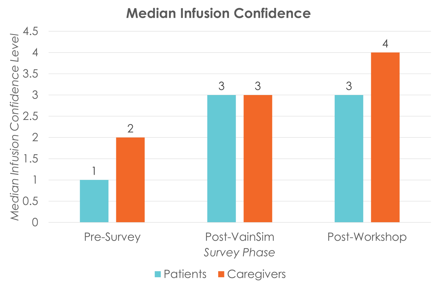VainSim scored in the 95th percentile of usability scores, considered 'Excellent'. For participants living with a bleeding disorder and their caregivers, confidence in infusion skills significantly increased after using VainSim, and further increased after completing the infusion workshop.